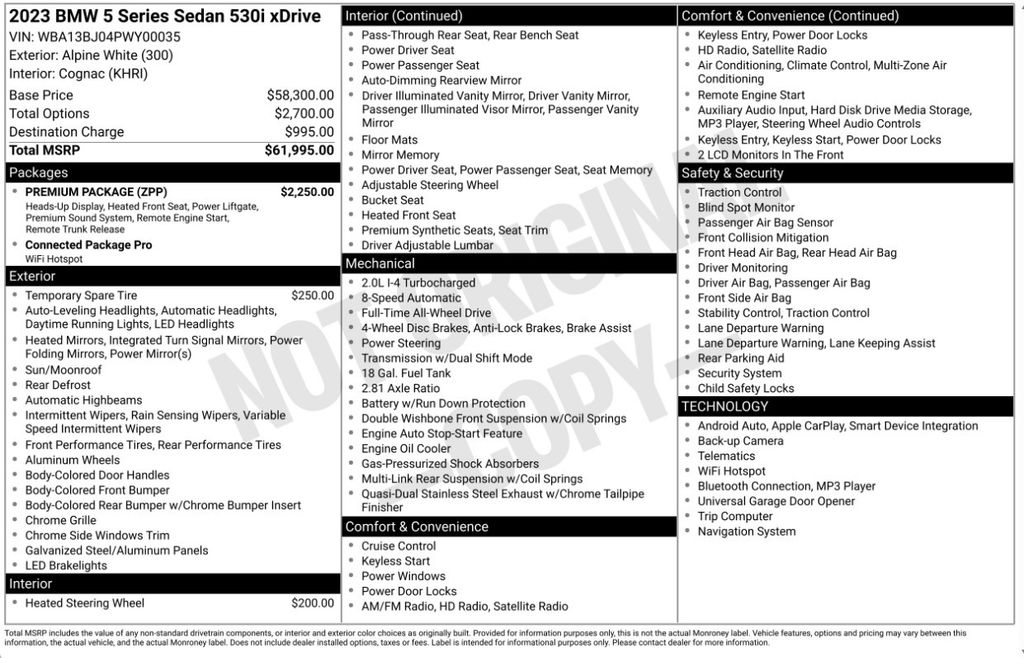 - 2023 BMW 5 Series 530i xDrive Alpine WhiteCARFAX One-Owner. AWD, Cognac Artificial Leather, Original MSRP $61,995, Connected Package Pro, harman/kardon Surround Sound System, Head-Up Display, Heated Front Seats, Navigation System, Power Tailgate, Premium Package, Remote Engine Start.23/32 City/Highway MPGAll prices are for retail purchase financed through BMWFS.Connected Package Pro, Premium Package (harman/kardon Surround Sound System, Head-Up Display, Heated Front Seats, Power Tailgate, and Remote Engine Start), AWD, Cognac Artificial Leather, Navigation System, 12 Speakers, 4-Wheel Disc Brakes, ABS brakes, Air Conditioning, Alloy wheels, AM/FM radio: SiriusXM, Apple CarPlay & Android Auto Compatibility, Auto High-beam Headlights, Auto tilt-away steering wheel, Auto-dimming door mirrors, Auto-dimming Rear-View mirror, Automatic temperature control, BMW Assist eCall, BMW TeleServices, Brake assist, Bumpers: body-color, ConnectedDrive Services, Delay-off headlights, Driver door bin, Driver Lumbar Support Only (DISC), Driver vanity mirror, Dual front impact airbags, Dual front side impact airbags, Electronic Stability Control, Emergency communication system: BMW Assist eCall, Enhanced USB/Bluetooth Plus Smartphone Integration, Exterior Parking Camera Rear, Four wheel independent suspension, Front anti-roll bar, Front Bucket Seats, Front Center Armrest, Front dual zone A/C, Front reading lights, Fully automatic headlights, Garage door transmitter, Genuine wood console insert, Genuine wood dashboard insert, Genuine wood door panel insert, Heated door mirrors, Heated Steering Wheel, Hi-Fi Sound System, Illuminated entry, Leather Shift Knob, Leather steering wheel, Live Cockpit Pro w/Navi, Low tire pressure warning, Lumbar Support, Memory seat, Occupant sensing airbag, Outside temperature display, Overhead airbag, Panic alarm, Passenger door bin, Passenger vanity mirror, Perforated Sensatec Upholstery, Power door mirrors, Power driver seat, Power Front Seats, Power moonroof, Power passenger seat, Power steering, Power windows, Radio data system, Radio: AM/FM Audio System, Rain sensing wipers, Rear anti-roll bar, Rear reading lights, Rear seat center armrest, Rear window defroster, Remote keyless entry, Security system, SiriusXM Satellite Radio w/1 Year Subscription, Speed control, Speed-sensing steering, Speed-Sensitive Wipers, Split folding rear seat, Sport Seats, Sport steering wheel, Steering wheel memory, Steering wheel mounted audio controls, Tachometer, Telescoping steering wheel, Tilt steering wheel, Traction control, Trip computer, Turn signal indicator mirrors, Variably intermittent wipers, Wheels: 18" x 8" Double-Spoke Burnished Orbit Gray, and Wheels: 18" x 8" W-Spoke Reflex Silver.
