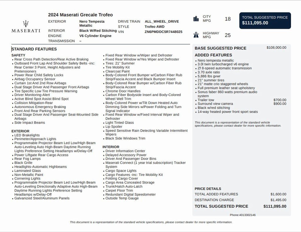 - 2024 Maserati Grecale Trofeo Nero Tempesta MetallicOriginal MSRP $111,095, Surround View Camera Pkg, Navigation System.Priced below KBB Fair Purchase Price!All prices are for retail purchase financed through BMWFS.Navigation System, 14 Speakers, 14-Way Heated Power Front Sport Seats, 3.70 Axle Ratio, 4-Wheel Disc Brakes, ABS brakes, Adaptive suspension, Air Conditioning, Alloy wheels, AM/FM radio: SiriusXM, Apple CarPlay/Android Auto, Auto High-beam Headlights, Auto-dimming door mirrors, Auto-dimming Rear-View mirror, Auto-leveling suspension, Automatic temperature control, Brake assist, Bumpers: body-color, Compass, Delay-off headlights, Driver door bin, Driver vanity mirror, Dual front impact airbags, Dual front side impact airbags, Electronic Stability Control, Emergency communication system: Maserati Connect, Exterior Parking Camera Rear, Four wheel independent suspension, Front anti-roll bar, Front Bucket Seats, Front Center Armrest, Front dual zone A/C, Front reading lights, Full Premium Leather Seat Upholstery, Garage door transmitter: HomeLink, Heated door mirrors, Heated front seats, Illuminated entry, Leather steering wheel, Low tire pressure warning, Memory seat, Occupant sensing airbag, Outside temperature display, Overhead airbag, Overhead console, Passenger door bin, Passenger vanity mirror, Power door mirrors, Power driver seat, Power Liftgate, Power moonroof, Power passenger seat, Power steering, Power windows, Radio data system, Radio: Sonus Faber 860 Watts Premium Audio System, Rain sensing wipers, Rear air conditioning, Rear anti-roll bar, Rear fog lights, Rear reading lights, Rear seat center armrest, Rear window defroster, Rear window wiper, Remote keyless entry, Security system, Speed control, Speed-sensing steering, Speed-Sensitive Wipers, Split folding rear seat, Spoiler, Steering wheel memory, Steering wheel mounted audio controls, Tachometer, Telescoping steering wheel, Tilt steering wheel, Traction control, Trip computer, Turn signal indicator mirrors, Variably intermittent wipers, Voltmeter, and Wheels: 21" Matte Crio Staggered.